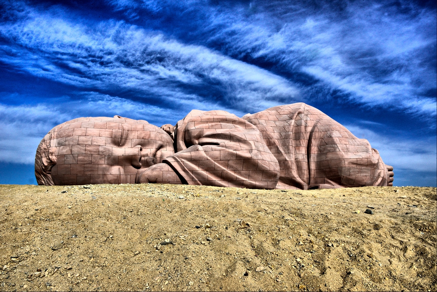 - Đại Địa Chi Tử ( 大地之子 ) - Đứa con của Trái Đất – Tác phẩm là hình ảnh một em bé khổng lồ đang nằm sấp, ngủ ngon lành giữa sa mạc mênh mông với chiều dài 15m, cao 4.3m, rộng 9m. Nhìn từ trên cao tựa như đứa con của đất mẹ, càng đến gần càng cảm thấy chấn động! Giữa vùng đất hoang vu rộng lớn, một em bé với thần thái an nhiên đang nằm úp mặt, tựa như đang yên giấc trong lòng mẹ.